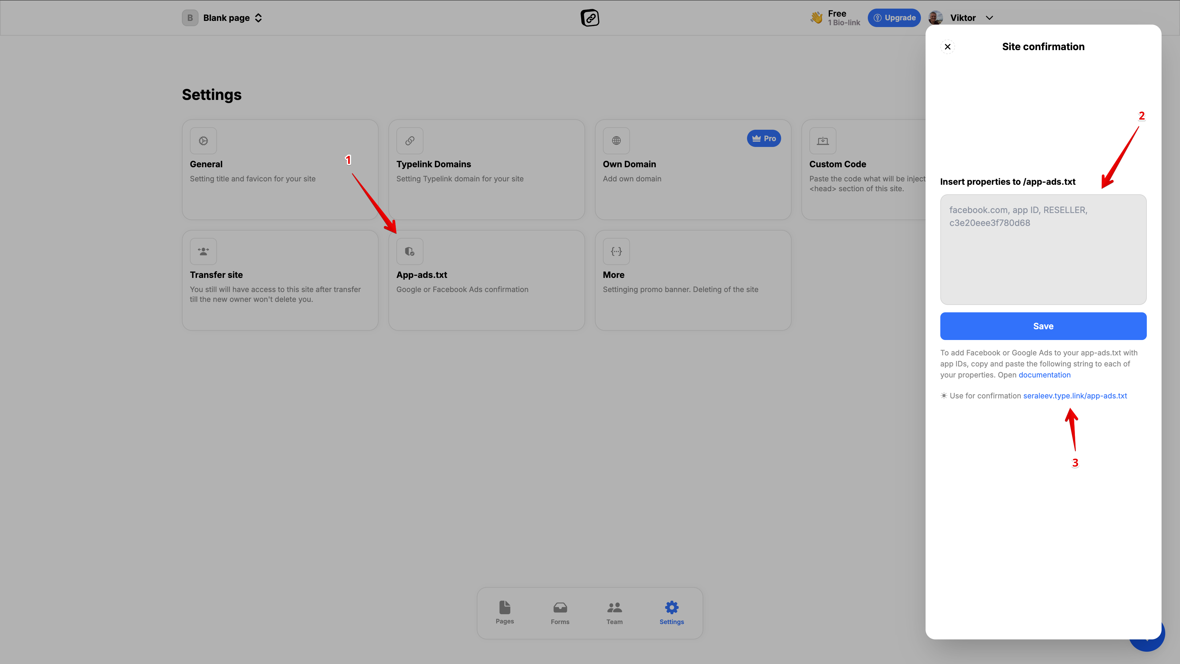 Typelink enables you to add insert properties related to your [Facebook App Ads](https://developers.facebook.com/docs/app-ads) And [Google Admob](https://support.google.com/admob/answer/9787936?hl=en\&ref_topic=7384409\&sjid=11573838645266687390-SA) account to **/app-ads.txt**.